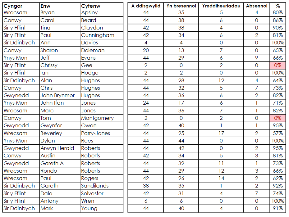 Nifer y cyfarfodydd na fynychodd yr Aelod ac na chynigiodd ymddiheuriadau ar eu cyfer.