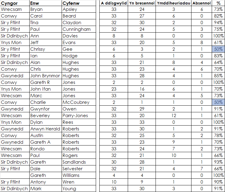 Nifer y cyfarfodydd na fynychodd yr Aelod ac na chynigiodd ymddiheuriadau ar eu cyfer.