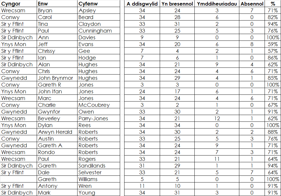 Nifer y cyfarfodydd nad oedd yr Aelod yn gallu eu mynychu ond wedi rhoi ymddiheuriadau ar eu cyfer.